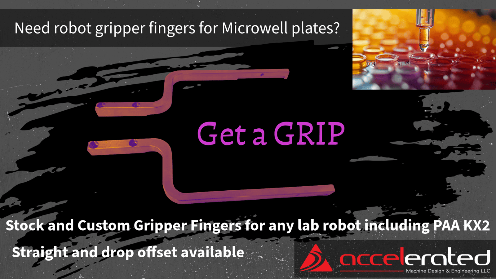 Contact us for stock or custom grippers for lab robots. We provide microwell plate gripper fingers for PAA KX2 Robots and many other brands. We make gripper fingers in a variety of materials including stainless steel, aluminum, and many engineering plastics for special applications.